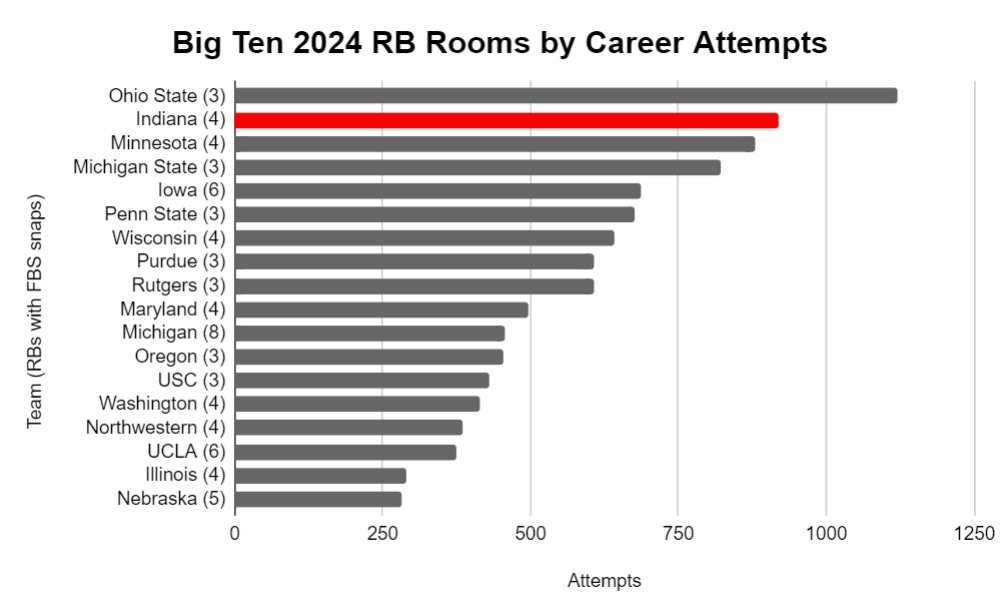 Cignetti pushed his staff to bring in proven producers through the portal, rather than potential producers, which means – if you read about Kurtis Rourke’s experience compared to other Big Ten QBs and IU’s substantial WR targets lead on the Big Ten – the Hoosiers have one of the most experienced offenses in the conference, maybe even the nation. The RBs room contributes to that, as Indiana’s incoming career FBS rushing attempts from its RBs is second to Ohio State. Justice Ellison is 4th in the conference, with 427 FBS carries.