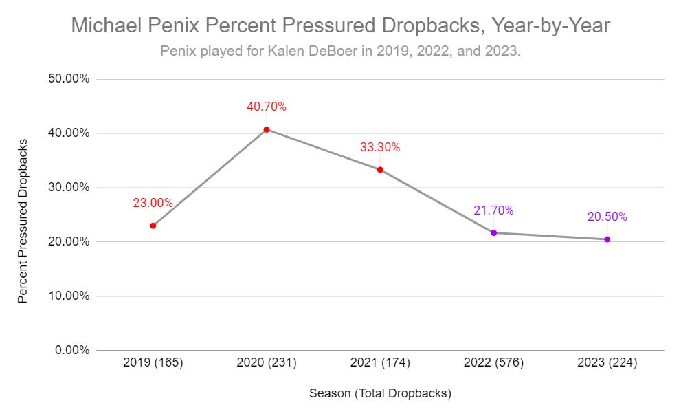 Much of this begins with his protection. Washington’s offensive line is graded 6th in the nation in pass-blocking, and Penix is 6th in the nation in fewest pressured dropbacks (20.5%). In his three years at Indiana, Penix was under pressure on 33.3% of his dropbacks. DeBoer’s system has a knack for keeping its QBs clean, though. Within that percentage at Indiana, Penix was only under pressure on 23% of his dropbacks under DeBoer in 2019. Once DeBoer left, he was under pressure on a whopping 37.5% of his dropbacks between 2020 and 2021.