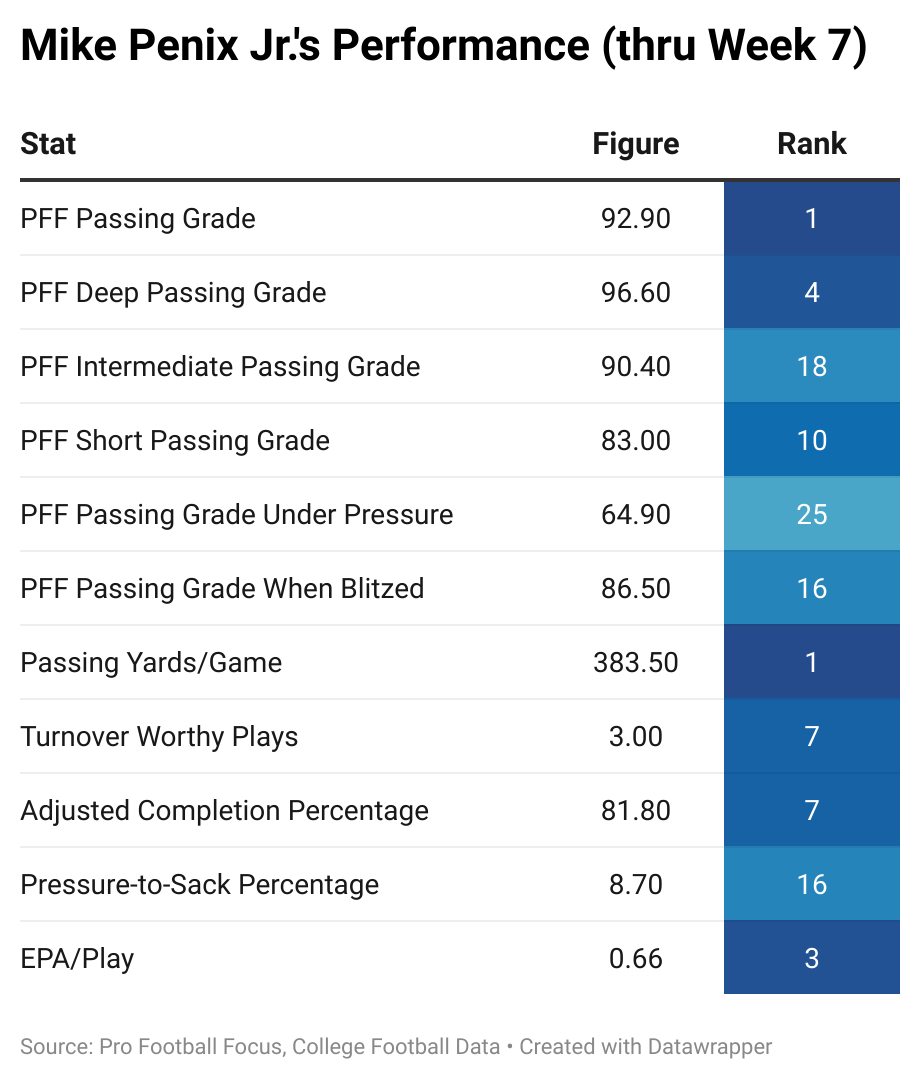When considering the high amount of pressure Penix was under all season in 2020, the 114th-ranked Indiana rushing attack, and the realized competence of Nick Sheridan as an offensive coordinator, it’s pretty clear that Penix (and Jack Tuttle, of course) shouldered far more of the load that season than was understood at the time. Indiana’s defense stole the show week-after-week and was 13th nationally in takeaways, but IU’s lead RB Stevie Scott averaged only 3.6 yards per carry, and if Penix wasn’t heaving the ball to Fryfogle for 19.5 yards per catch, he was hitting Philyor or Hendershot underneath (both pass-catchers saw dips in performance from 2019). Miles Marshall – now at Miami (OH) – was his 3rd WR. Yet, he ended the season with the 25th-best PFF Offensive Grade among the nation’s QBs.