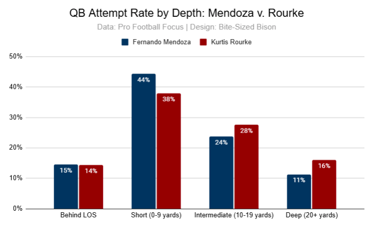 Now, with that said, given his situation at Cal, the only way Mendoza was pushing the ball downfield was with a prayer. The chart below shows Mendoza’s attempt rate by depth of target versus Rourke’s.