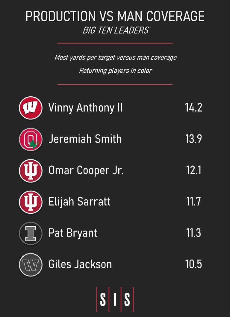 Indiana’s perimeter WRs weren’t targeted that often against man coverage – just 24% and 20% of targets. But when they were targeted, it was downfield, as Sarratt and Cooper were 6th and 7th among Big Ten WRs in average depth of target against man (15.8 and 15.5 yards). Execution on those plays is how they found the numbers listed in SIS’ post above.
