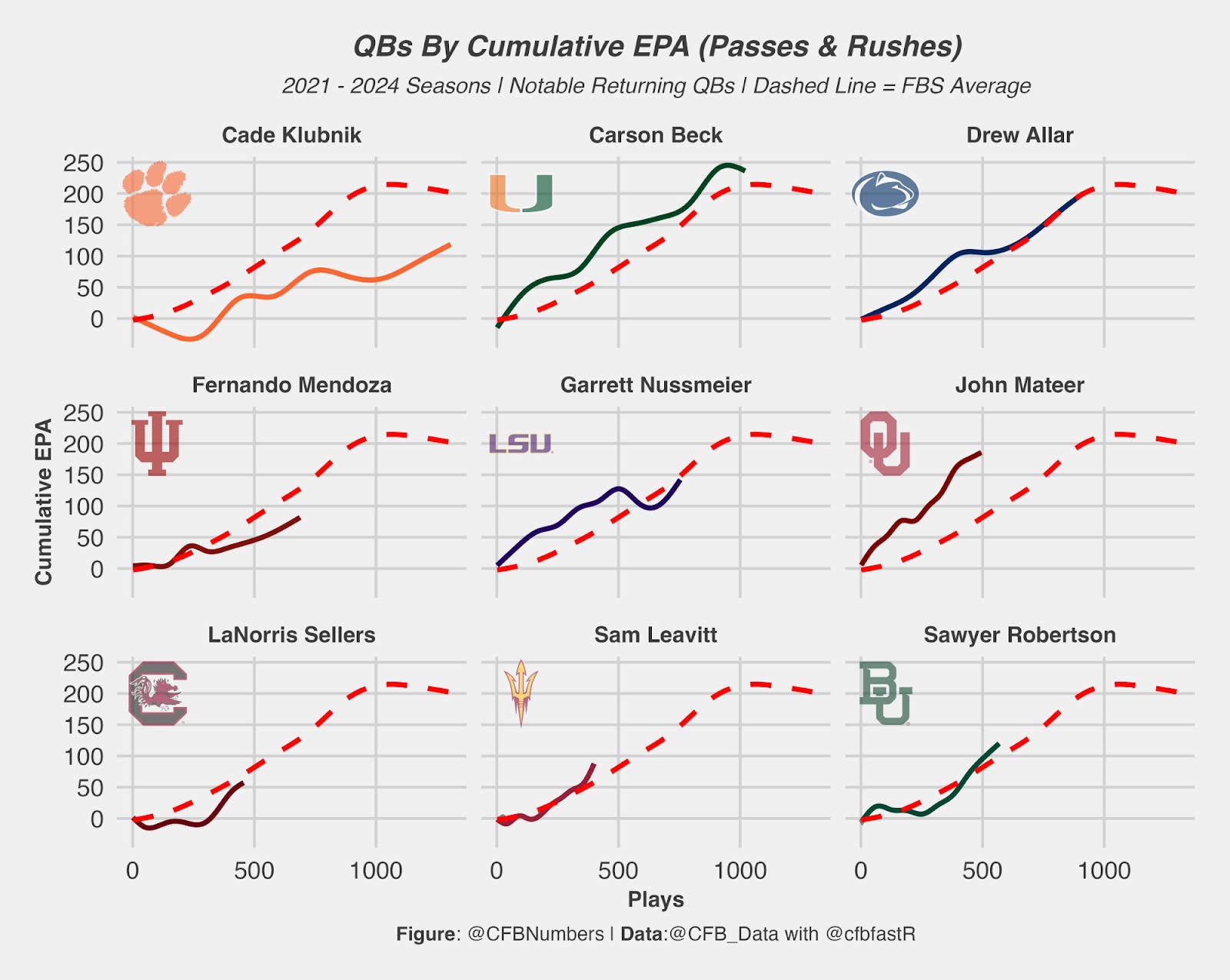 CFBNumbers always pulls through with an interesting graphic, and Indiana is frequently included, because that’s the state of things lately. Here, the graph shows cumulative EPA over the course of the 2024 season, compared to the average FBS QB during the 2021-24 seasons. The idea is that this line shows progressive value for each QB as the season moved along.