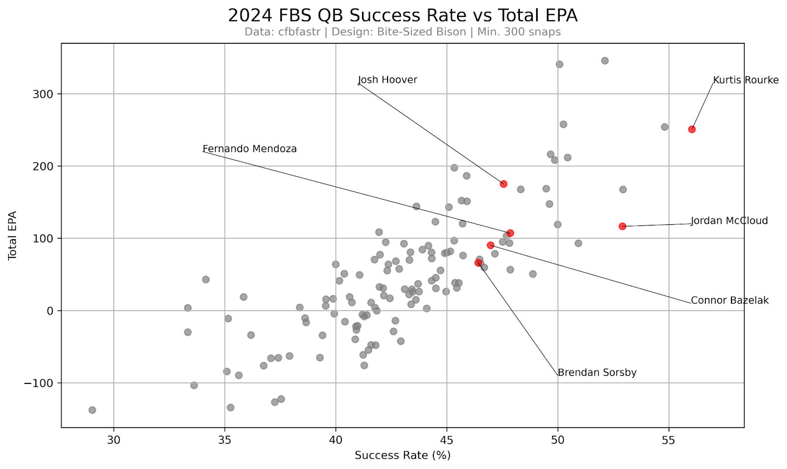 All of these QBs ranked in the top-30 in success rate during the 2024 season, which was higher than Garrett Nussmeier (charted above for LSU), Shedeur Sanders (Colorado), Quinn Ewers (Texas), Jalen Milroe (Alabama, with Kalen DeBoer), Carson Beck (charted above), Tyler Shough (Louisville), Cade Klubnik (charted above for Clemson), LaNorris Sellers (charted above for South Carolina), Riley Leonard (Notre Dame), and many more.