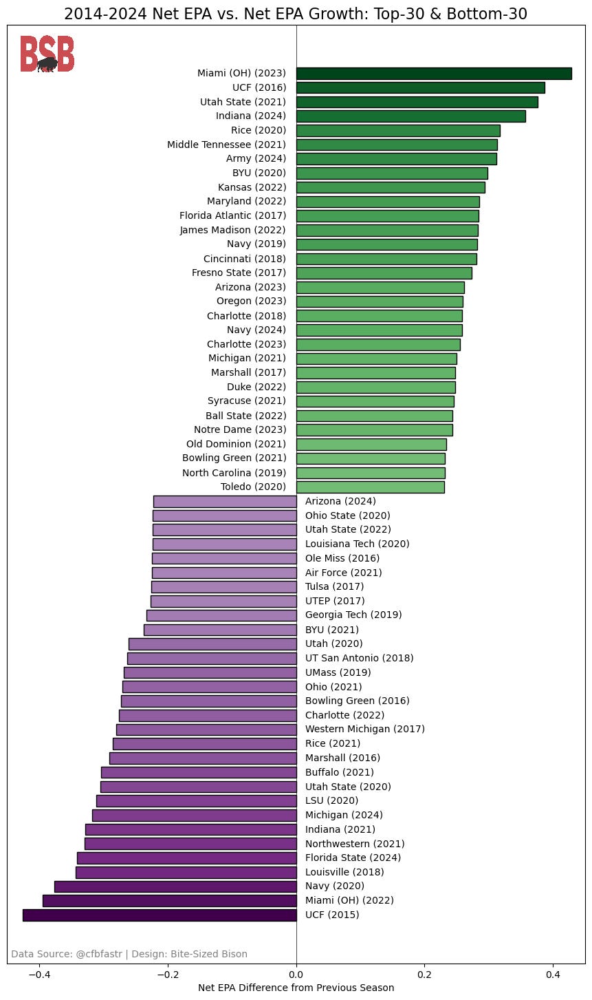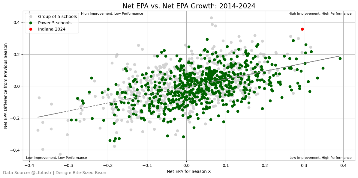 The chart below uses Net EPA/play (offensive EPA/play minus EPA/play allowed) and compares each season’s Net EPA to the previous season’s Net EPA to show growth between seasons. As the chart shows, top-right means there was high improvement between seasons with high performance. That is where this 2024 Indiana team sits.