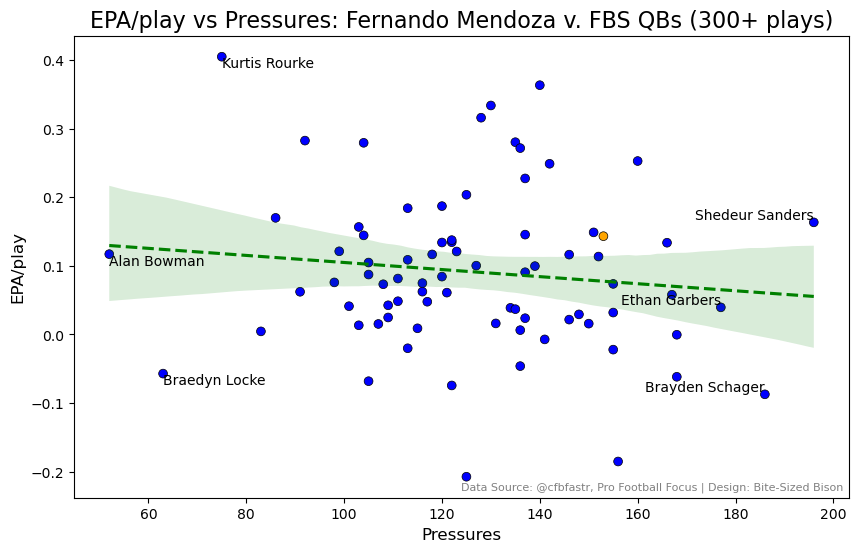 What is perhaps the defining statistical characteristic of Mendoza’s season is that he was as productive as he was under the pressure he endured. He was the 4th-most sacked QB in the country in 2024, succumbing to opposing defenses 40 times (a three-way tie led the nation, with 41). His offensive tackles ranked 3rd and 12th among all ACC OLs in allowed QB pressures. Yet, overall, he remained relatively efficient, as shown in the chart below.