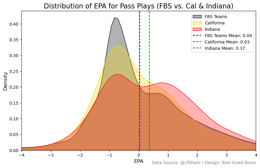 When Cal passed the ball, it was actually fairly average. The chart below plots the distributions of EPA per pass play for the FBS, Cal, and Indiana.