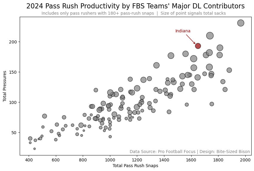As the chart indicates, the considered linemen for each team on this chart were those who rushed the passer 180+ times. Indiana was one of 29 teams to have at least six linemen qualified – Mikail Kamara, James Carpenter, Lanell Carr, CJ West, Tyrique Tucker, and Marcus Burris – and that group totaled the 3rd-most pressures on the 13th-most pass-rush snaps in the nation. Rushing the passer is a massive dimension to Haines’ defensive scheme.