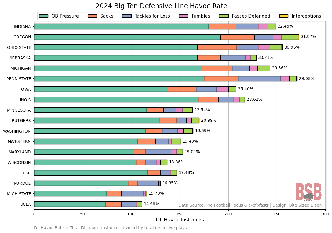 The Indiana DL was responsible for 32.5% of its defensive havoc instances, which was the most in the Big Ten, and the Hoosiers’ DL was 4th in total DL havoc.