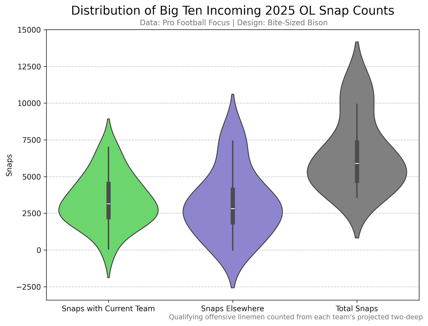The chart below indicates which Big Ten teams own the most pre-2025 snaps along their lines going into 2025 Fall Camp season, as well as whether those snaps were spent with each lineman’s current team or elsewhere. What jumps out immediately is that the numbers between returning snaps and snaps from elsewhere are fairly even.