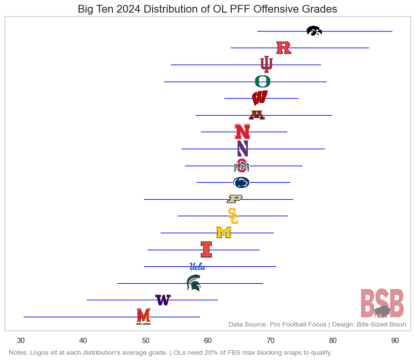 This is where Big Ten teams ranked by average PFF Offensive grade among their OL starters, as well as the distribution of those individual grades, at the end of the 2025 season: