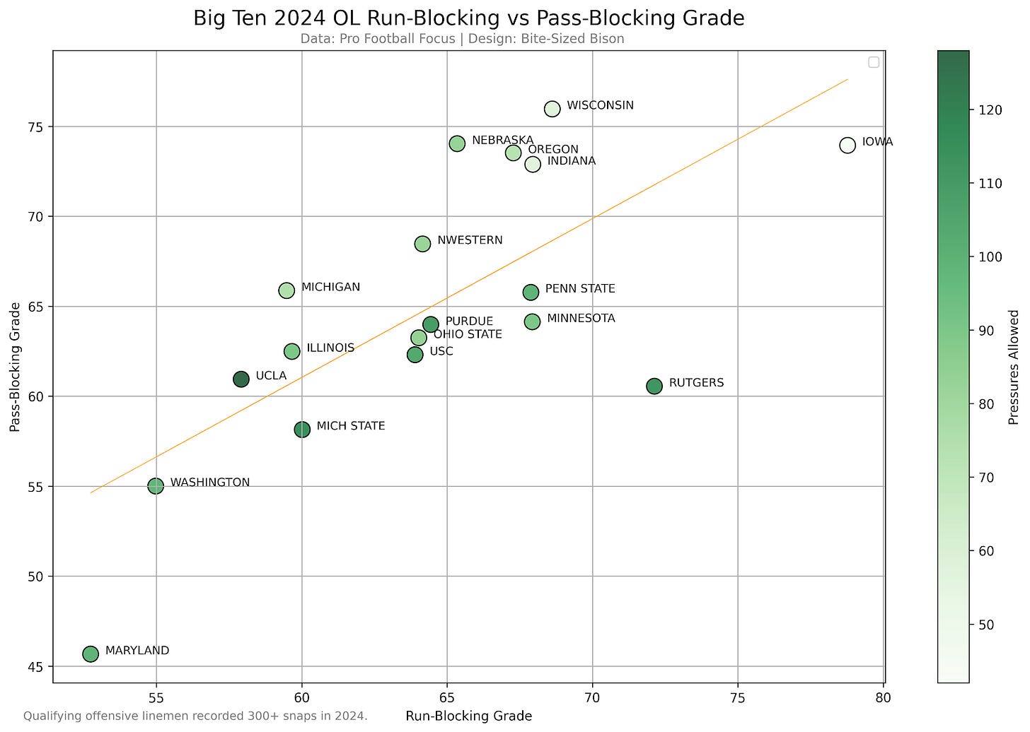 Additionally, the chart below conveys each Big Ten team’s run-blocking versus pass-blocking grades, as well as the number of QB pressures each line allowed.