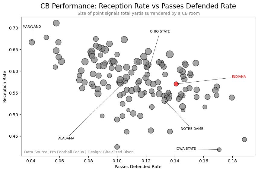 Note: Reception Rate = % of targets completed, Passes Defended Rate = % of targets resulting in PBU or INT, Size of points = total yards allowed by CBs