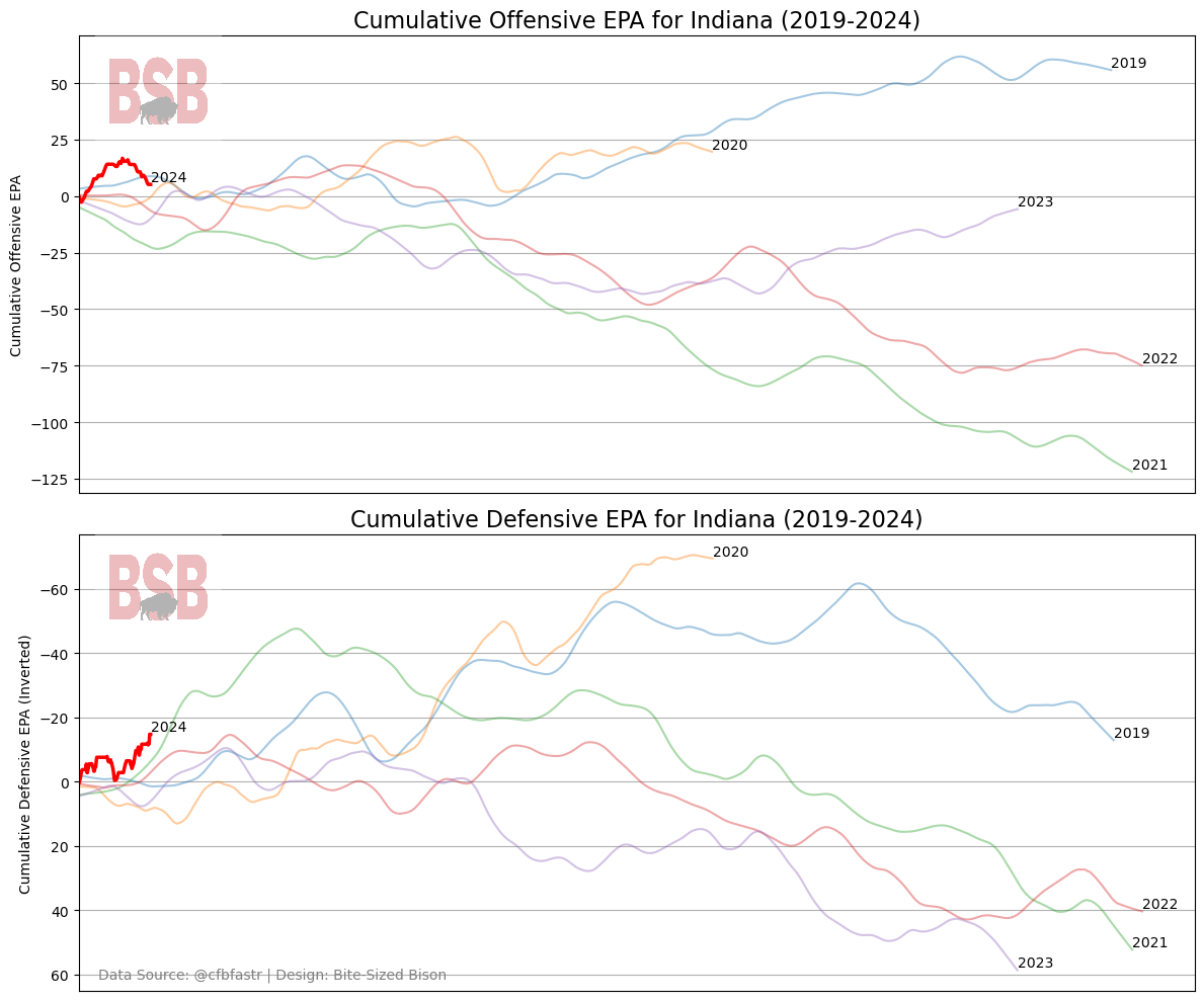 Indiana was a drastically different team in any of the five seasons between 2019 and 2023, and 2024 is expected to be even more so. Comparing 2024 offensive and defensive cumulative EPA to the previous five seasons can offer some insight into how the season is progressing in relation to recent years.