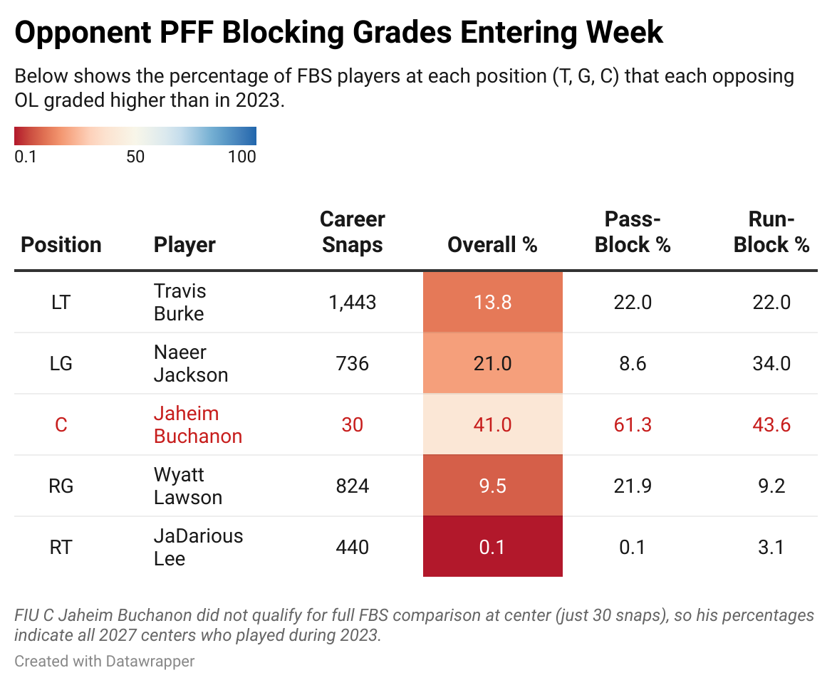 FIU Offensive Line Yards/Rush: FIU’s offensive line yards/rush was 4th-to-last in 2023, and it returns four of those five offensive linemen and is expected to start a center who has 30 career snaps (see more below).