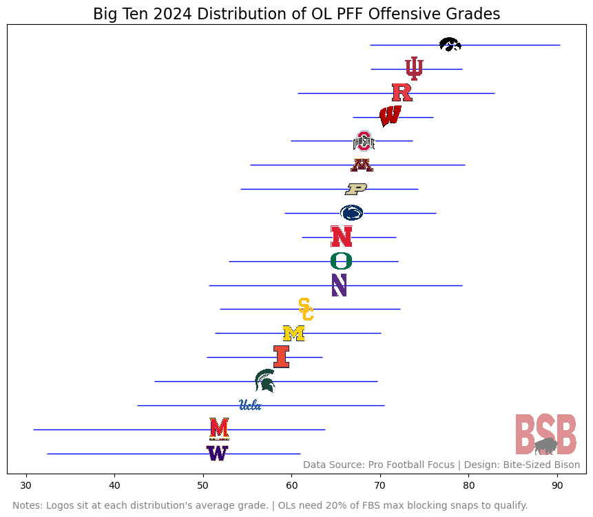 After a micro look at OL production, I want to zoom out and compare to the rest of the Big Ten. The below chart filters all PFF OL grades to account for any OL that records at least 20% of the highest recorded blocking snaps and draws a line for each team from its minimum grade to its maximum. Each team’s logo is then placed at the average grade.