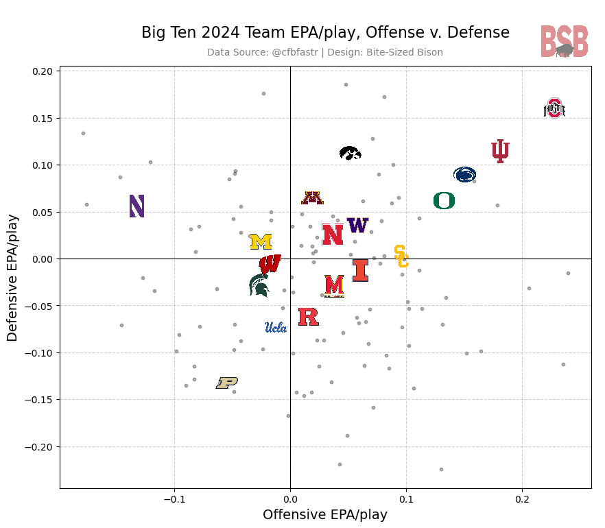 EPA (Estimated Points Added) is the best existing metric for conveying a play’s value. I explain a bit in the Gameday Roundup how it works, and in the below graph, each Big Ten team’s EPA is split between offense and defense to show which teams are statistically better in each phase.
