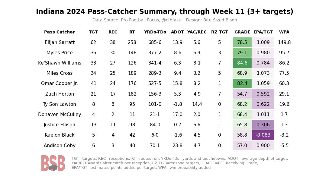 Justice Ellison was targeted a career-high 5 times against Michigan, and he’s been targeted 8 times in the last two weeks, as Indiana diversifies its passing attack. It still hasn’t produced the most valuable results yet, though.