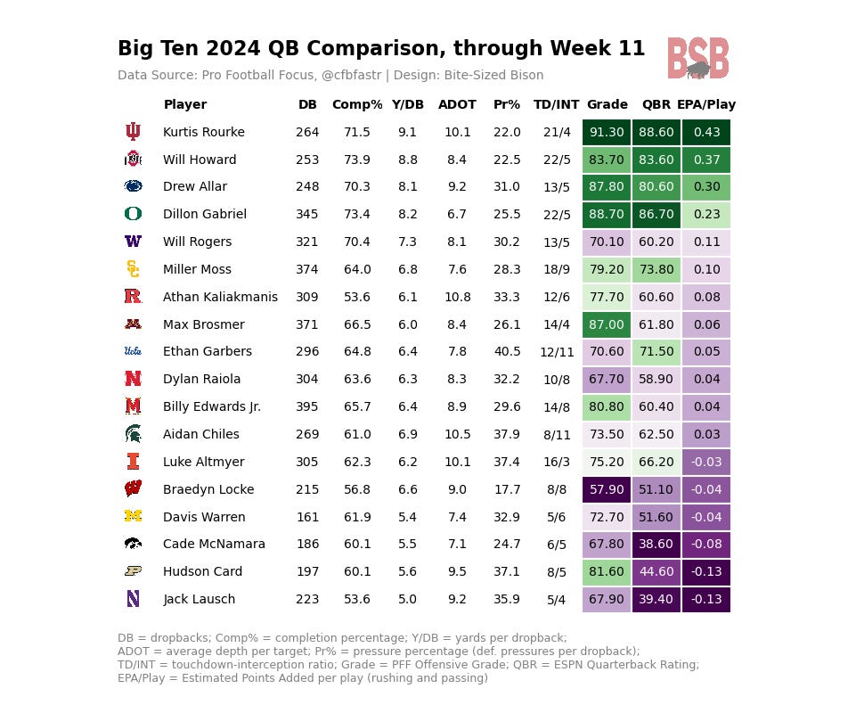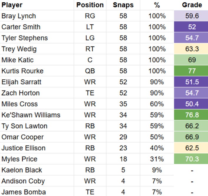 What can only be determined by the eye test is that Rourke was uncomfortable in ways we hadn’t seen yet this season, and that is reflected in his dip from 0.55 EPA/play to 0.43. However, he still recorded a 70.4% adjusted completion percentage, which was 7th among Big Ten QBs in Week 11, and the 2nd-best offensive grade under pressure by a long shot — 15.4 points above the 3rd-best and 1 point behind 1st-place Will Howard.