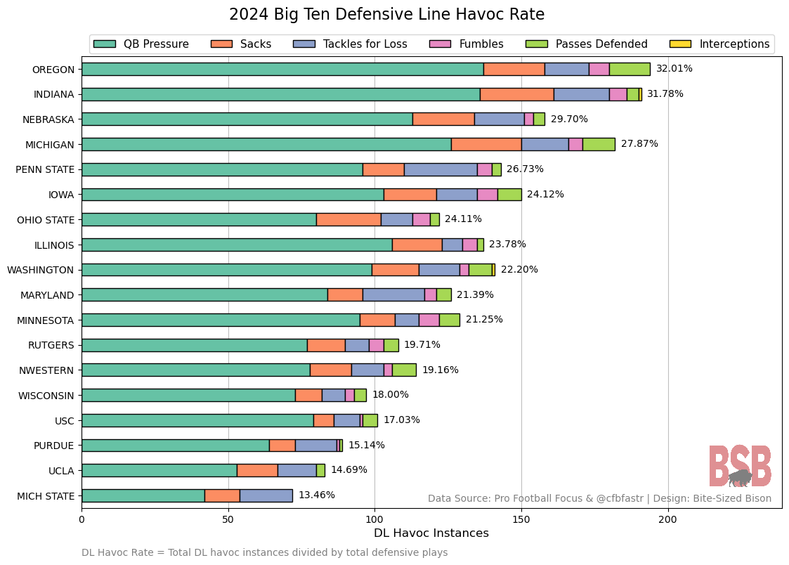 With this JMU staff coming to Indiana, there has been a major philosophical change on defense, charging the DL with creating havoc rather than just the LBs. The Hoosiers ranked second-to-last in DL havoc rate in 2023. Havoc is defined in different ways in different places, but I chose to include plays that involved QB hurries, QB hits, sacks, TFLs, forced/recovered fumbles, batted/deflected passes, and interceptions – basically any time a DL is negatively impacting the offense. The benefit of the below chart is that it disaggregates the different havoc plays to show not just the total number of havoc plays but also how that havoc is achieved. The chart is then sorted by DL havoc rate (the percentage of defensive plays that feature DL havoc).