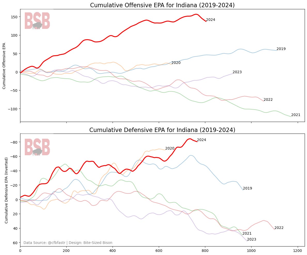 Indiana was a drastically different team in any of the five seasons between 2019 and 2023, and 2024 is expected to be even more so. Comparing 2024 offensive and defensive cumulative EPA to the previous five seasons can offer some insight into how the season is progressing in relation to recent years.