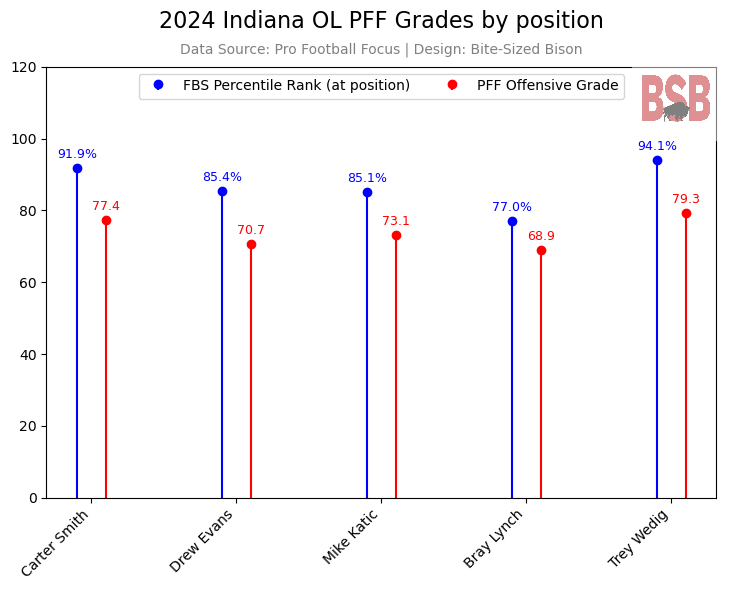 However, even with Stephens’ grade included, Indiana’s average PFF grade for its starting five OLs is 70.1, which would be roughly below Wisconsin for 4th in the Big Ten.