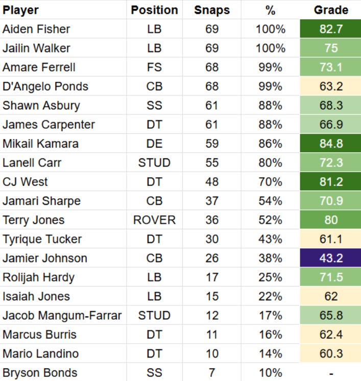 Something that was key to Indiana’s defensive success was keeping Aiden Fisher and Jailin Walker in optimal positions to make plays. Fisher logged his second-best grade of the season (via PFF), and Walker recorded his best. 10 of Michigan’s plays were upended due to singular efforts by either Fisher or Walker, they combined for 21 tackles, and neither allowed a catch for longer than 9 yards. It’s tough to ask for anything more from an LB duo.