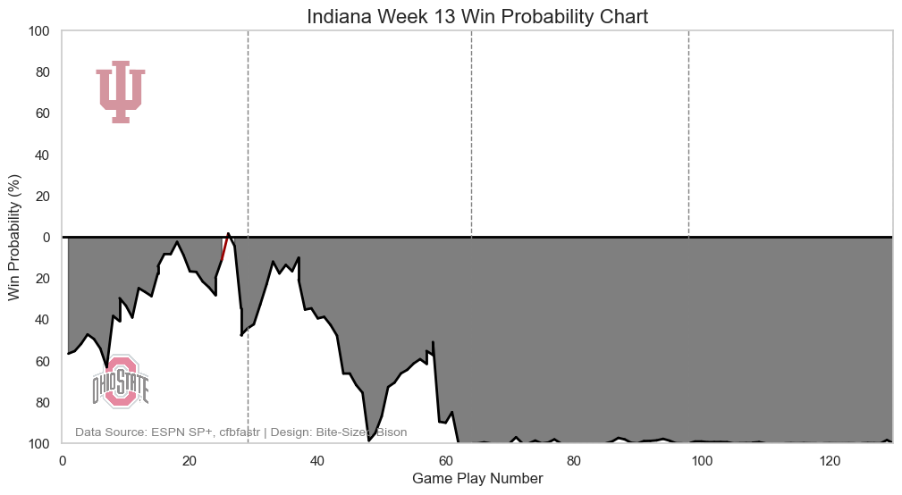Indiana suffered its first loss of the season (on Nov. 23!) to No. 2 Ohio State, 38-15, Saturday in Columbus after what was a game filled with uncharacteristic performances, from special teams to offensive play-calling and scheme. What will likely be remembered most from this game are Indiana’s punt-team blunders, as James Evans dropped a punt (giving the ball to Ohio State inside the 10-yard line) and Caleb Downs returned Ohio State’s first punt-return touchdown in 10 years (putting Ohio State up, 21-7). The Hoosier defense stacked a decent performance, providing strong resistance against Ohio State’s FBS-leading redzone offense and holding the Buckeyes to their 2nd-lowest offensive production of the season (316 yards), but a defense can stand only so much disadvantage over time.