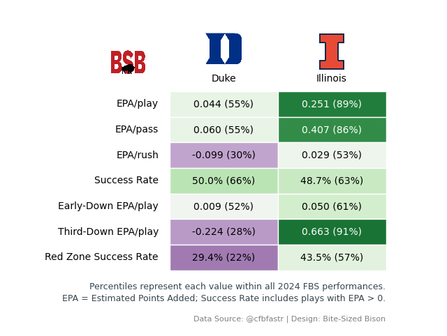 Both teams have played similar schedules — Illinois’ strength of schedule at 101st nationally according to ESPN FPI, Indiana’s at 117th — with each team’s toughest opponents being Duke (No. 63 in FPI) and Old Dominion (No. 56), respectively. This is how each team performed in those two games: