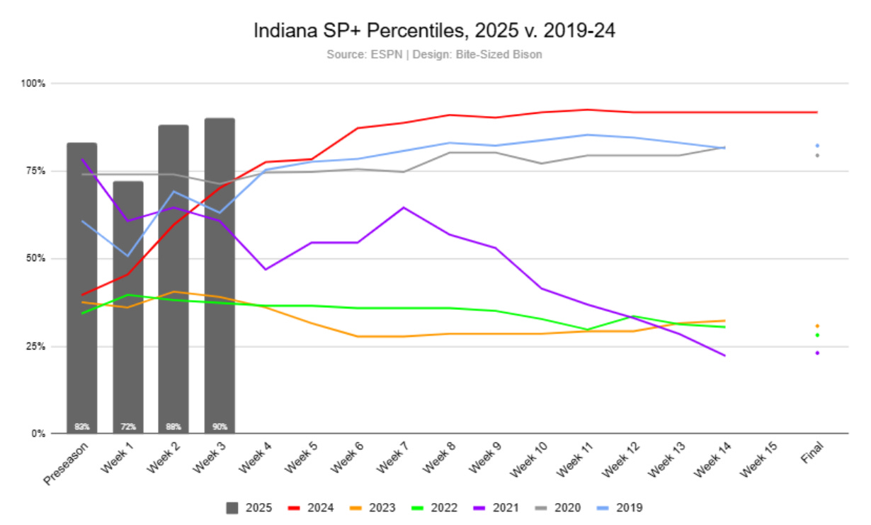 Note: Each week indicates Indiana’s ranking after the week’s game. For example, Indiana is in the 73rd percentile after its game versus Old Dominion in Week 1.