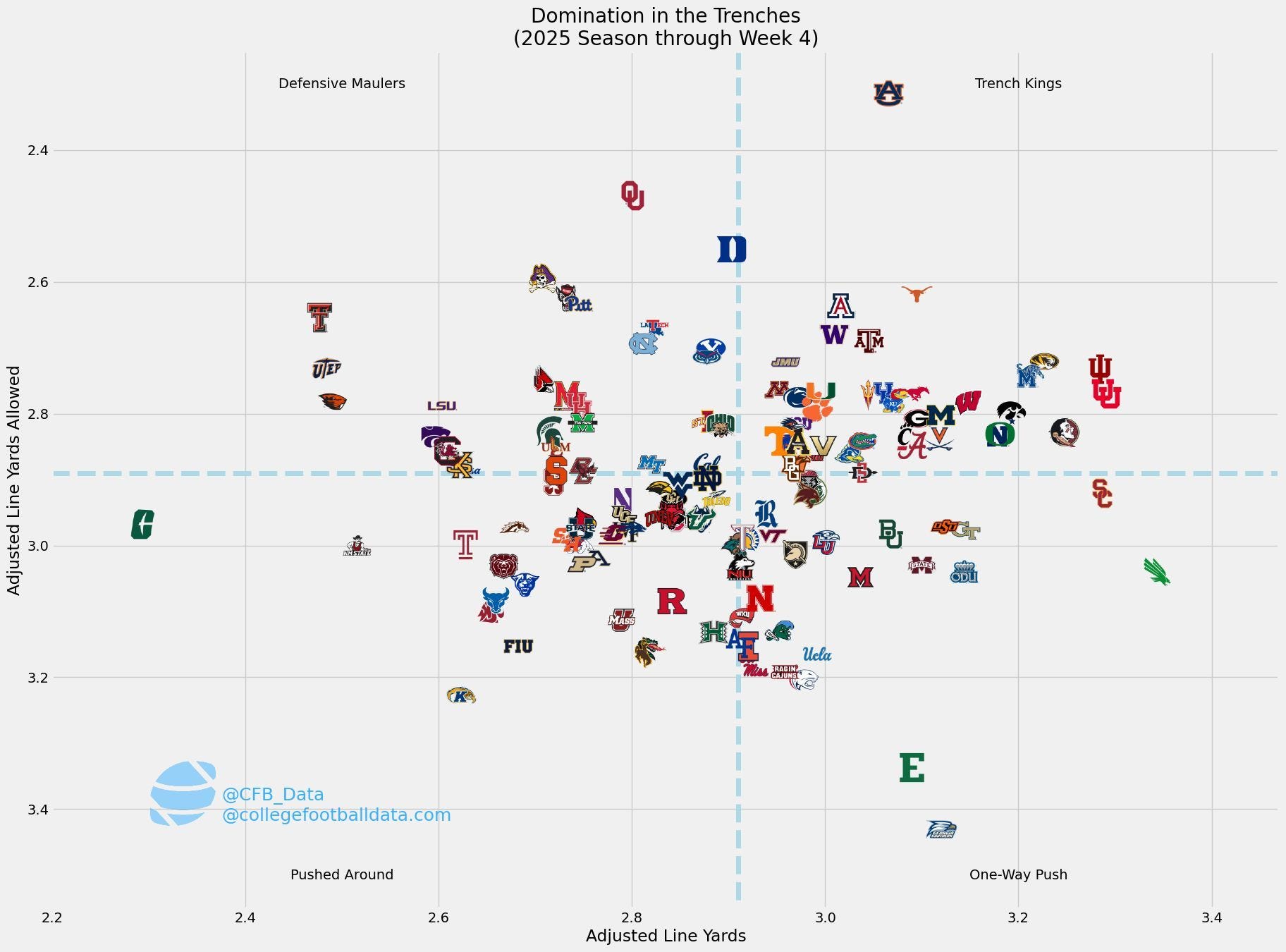 Iowa is simply a slow, grinding mechanism, daring an opponent to win the game. This is why, when Cignetti also noted that this week’s game is even more of a challenge than the Illinois game, he wasn’t wrong. Iowa is far more serious in the trenches than Illinois, and the game will not be played in Bloomington. The chart below (credit: Bill Radjewski of CollegeFootballData.com) conveys this physical nature with an opponent-adjusted line yards measure on both sides of the ball. Indiana and Iowa is going to be a rock fight in the trenches on every play.