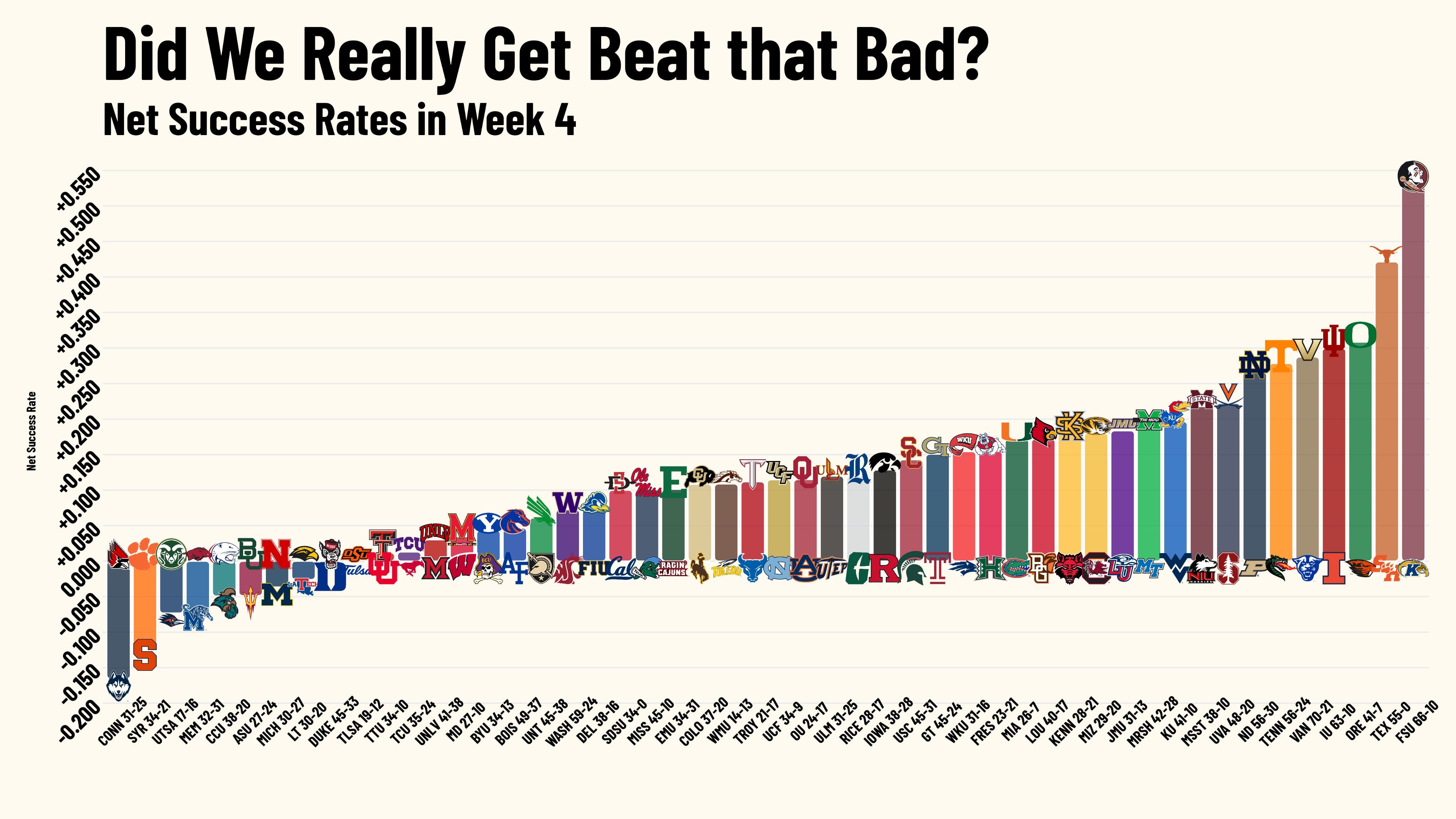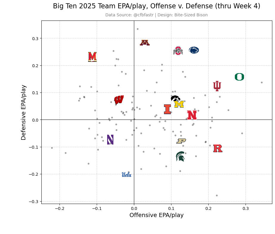 Indiana crushed Illinois in Week 4 (read the BSB Recap here, if you haven’t) and now has national pundits split into two majority factions — 1.) “Is this Indiana team better than last year’s Indiana team?”, and 2.) “Illinois isn’t that good, I guess!” There aren’t many top-10 teams as far right on the chart below as Illinois.