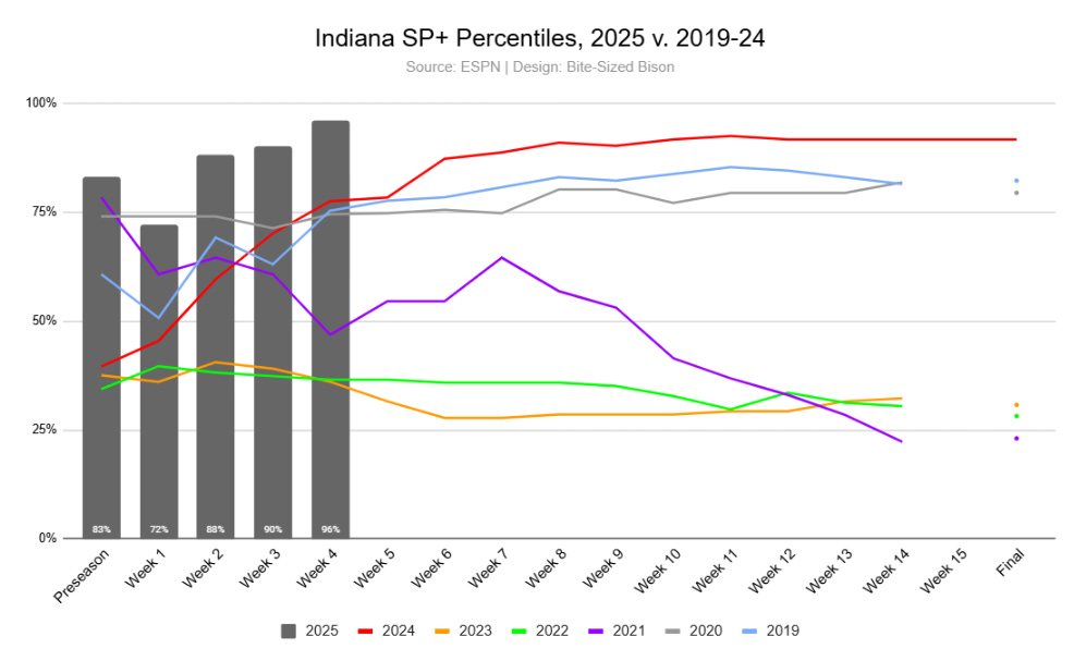 Indiana is ranked higher than we’ve ever seen in SP+. The Hoosiers jumped eight spots to No. 6 after beating Illinois.