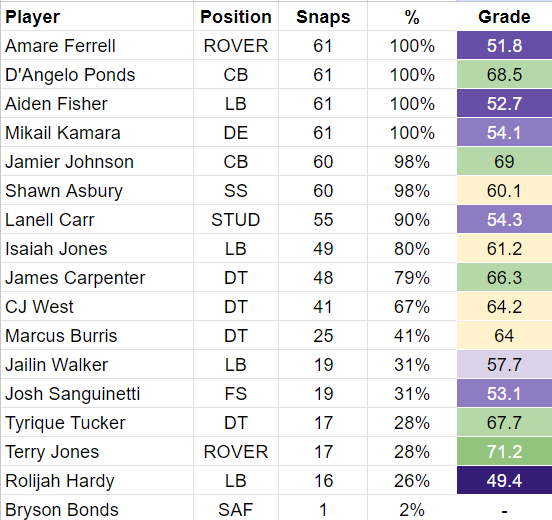Jailin Walker was injured fairly early in this one, playing only 19 snaps. Isaiah Jones and Rolijah Hardy filled in, but Walker’s absence was felt.