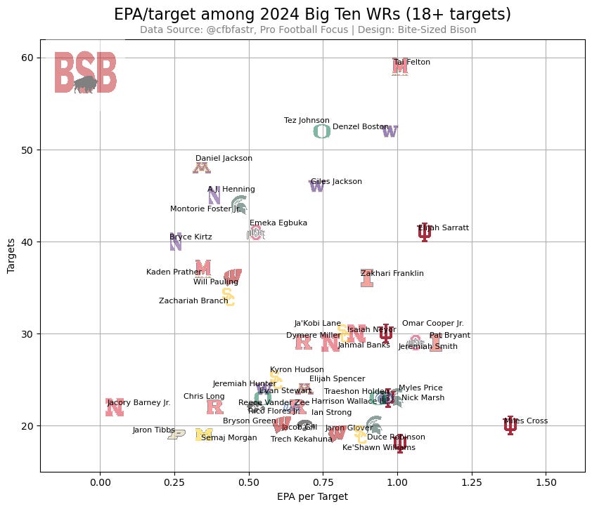 The chart below conveys each Big Ten WR’s EPA/target, which is not entirely a reflection of the receiver but more of a way to show the value of the plays when each receiver is targeted. This way, rather than accounting for a pass-catcher’s individual performance alone, it also accounts for offensive scheme and execution when that player is involved, creating an assessment of the offense’s success rather than simply the player’s.