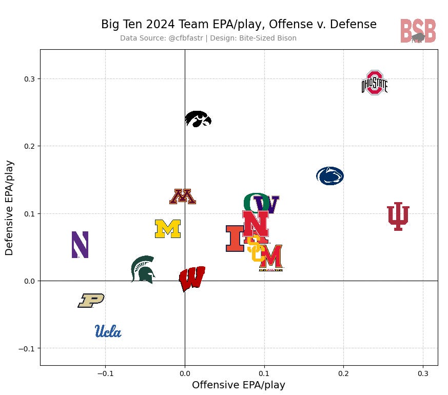 EPA (Estimated Points Added) is the best existing metric for conveying a play’s value. I explain a bit in the Gameday Roundup how it works, and in the below graph, each Big Ten team’s EPA is split between offense and defense to show which teams are statistically better in each phase.