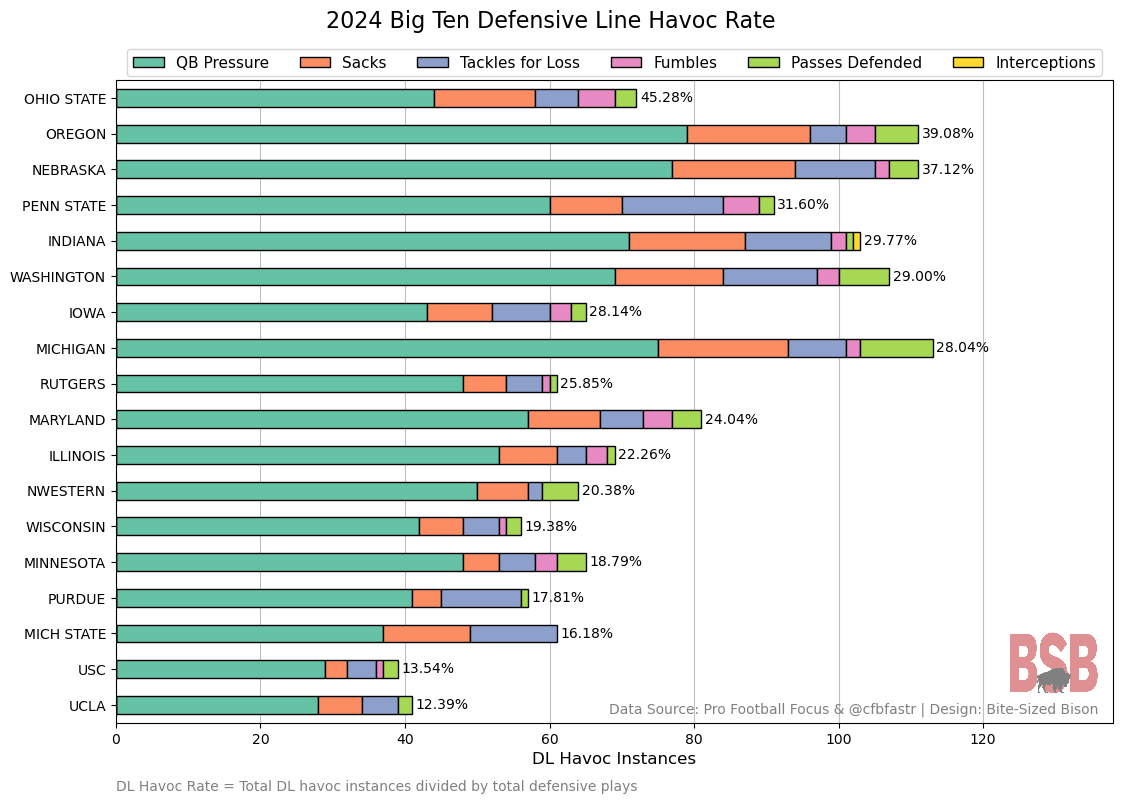 With this JMU staff coming to Indiana, there is going to be a major philosophical change on defense, charging the DL with creating havoc rather than just the LBs. The Hoosiers ranked second-to-last in DL havoc rate in 2023. Havoc is defined in different ways in different places, but I chose to include plays that involved QB hurries, QB hits, sacks, TFLs, forced/recovered fumbles, batted/deflected passes, and interceptions – basically any time a DL is negatively impacting the offense. The benefit of the below chart is that it disaggregates the different havoc plays to show not just the total number of havoc plays but also how that havoc is achieved. The chart is then sorted by havoc rate (the percentage of defensive plays that feature DL havoc).