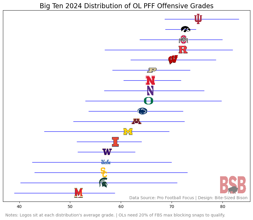 After a micro look at OL production, I want to zoom out and compare to the rest of the Big Ten. The below chart filters all PFF OL grades to account for any OL that records at least 20% of the highest recorded blocking snaps and draws a line for each team from its minimum grade to its maximum. Each team’s logo is then placed at the average grade.
