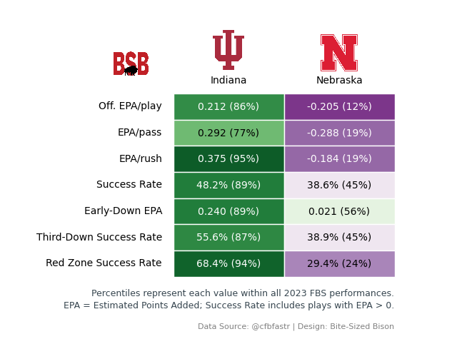 The major anticipated matchup was Indiana’s offense against Nebraska’s defense, but it wasn’t very competitive this week, as shown by Indiana’s offensive success rate, which ranks in the 89th percentile of 2023 performances.