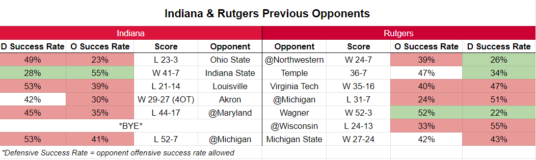 Granularly, there’s so little to point to for an Indiana advantage this week, especially on the offensive side. Rutgers’ defense is fairly stout. It allows some success on the ground, including two 200+ rushing yards games to Michigan and Wisconsin (as most teams are wont to do), but it’s allowed the 8th-fewest yards per game and is 37th in EPA/play. Despite Michigan State’s decent offensive red zone success last week, Rutgers remains 15th in the nation in defensive red zone success, where Indiana is (notoriously) 113th offensively. This defense has allowed some offensive success (as shown in the chart above) to teams like Virginia Tech (93rd offensively by SP+) and Michigan State (86th offensively by SP+), so any found offensive success might not be entirely surprising. This might be a situation where Indiana misses either of its injured RBs or would like to have a QB solidified into an offensive scheme by Week 8.