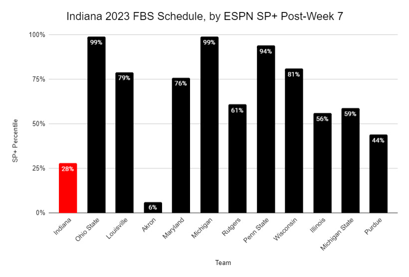 From the non-competitive gameplan against Ohio State in Week 1, to the 21-0 first half against Louisville and the goal line call at the end, to the near-loss to Akron (now 125th in SP+, though they lost their QB), to losing their last two games 96-24 and firing their offensive coordinator in between, to returning to the QB rotation in Week 7, there have been an endless number of follies from this program concentrated into the last couple of months. It’s difficult to take Indiana seriously in any context at the moment.