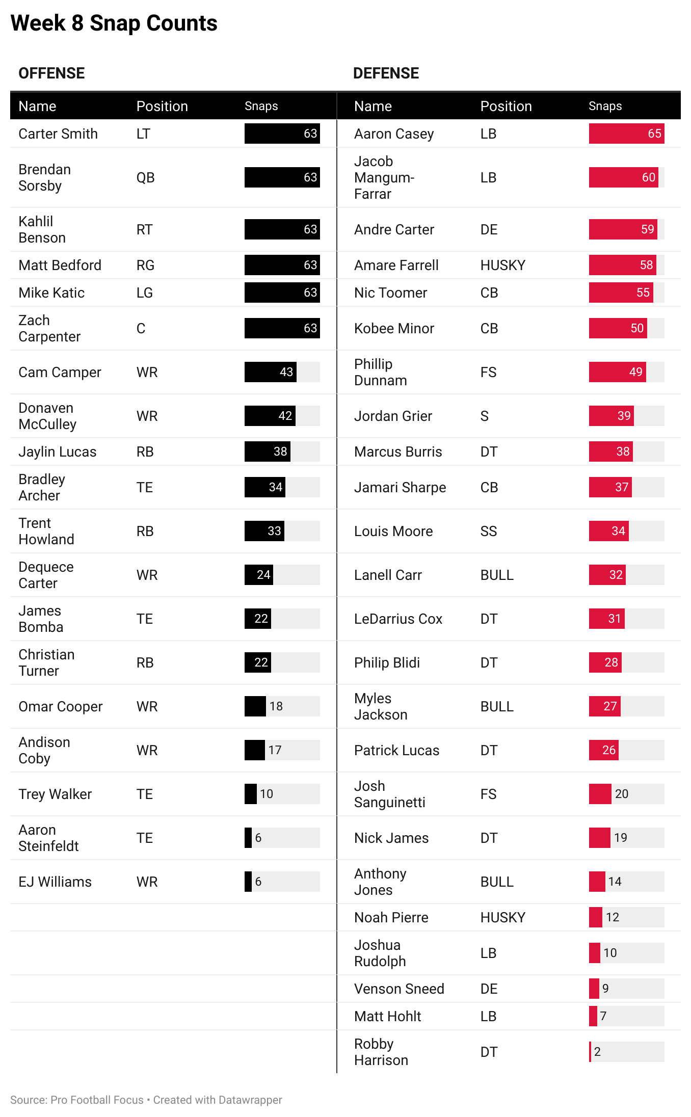 Lanell Carr’s snaps are back at a typical amount (32) since he only played 16 snaps last week.