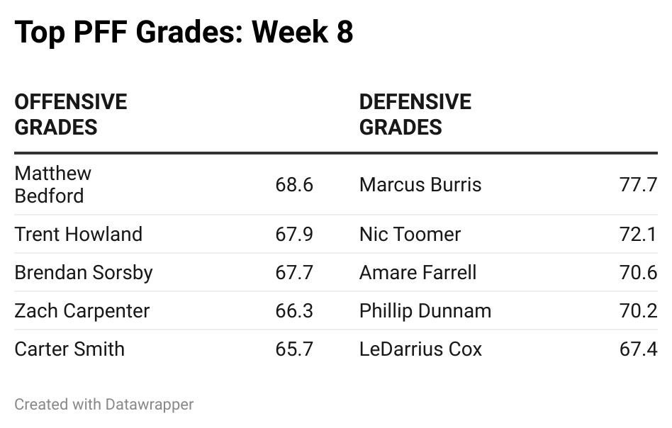 Aaron Casey has received dismal Defensive Grades each of the last four weeks and is now graded as the 17th-best LB in the conference. Jacob Mangum-Farrar is 21st.